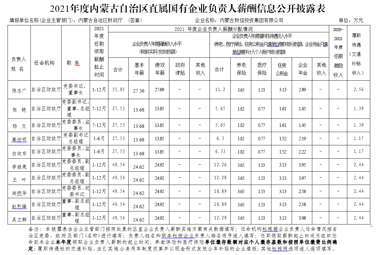 2021年度内蒙古自治区直属国有企业负责人薪酬信息公开披露表