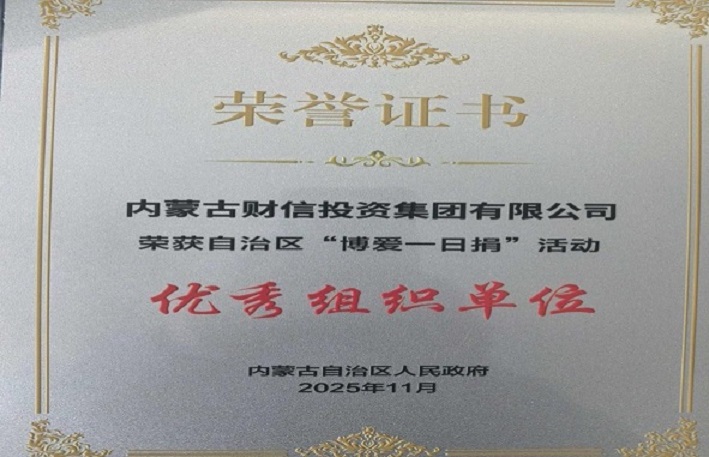 近日,内蒙古财信投资集团有限公司被内蒙古自治区政府授予“博爱一日捐”活动“优秀组织单位”荣誉称号,并作为获奖代表出席了在内蒙古电视台举行的颁奖仪式。